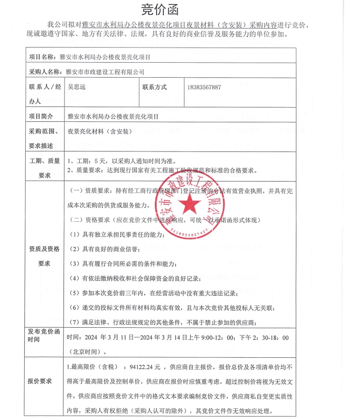 雅安市水利局辦公樓夜景亮化項目夜景材料(含安裝)采購內(nèi)容競價公告
