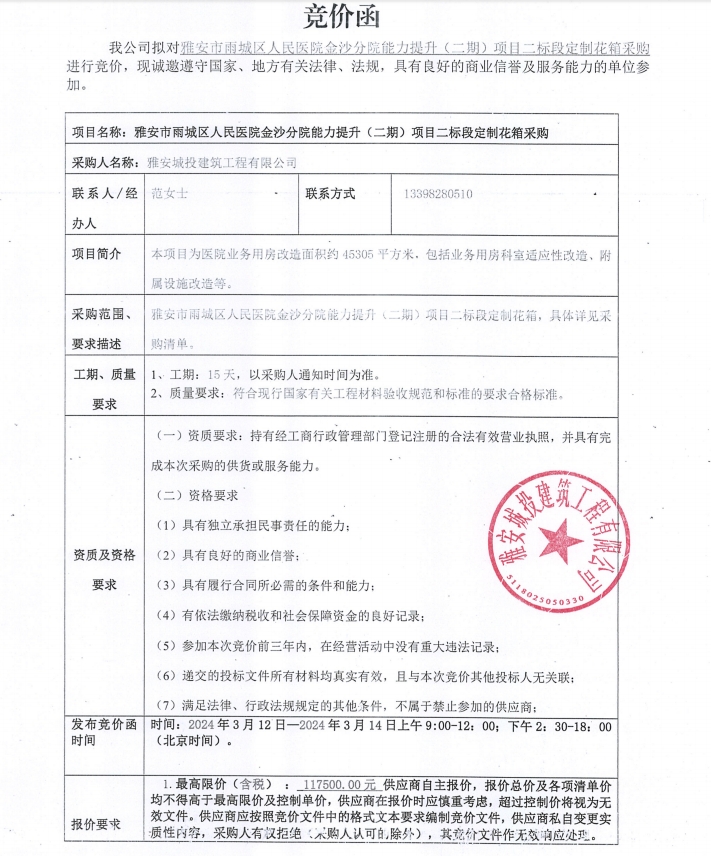 雅安市雨城區(qū)人民醫(yī)院金沙分院能力提升(二期)項(xiàng)目二標(biāo)段定制花箱采購競價(jià)公告