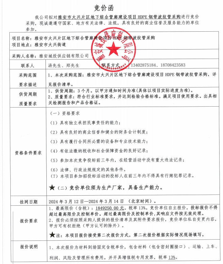 雅安市大興片區(qū)地下綜合管廊建設(shè)項(xiàng)目HDPE鋼帶波紋管采購競(jìng)價(jià)公告