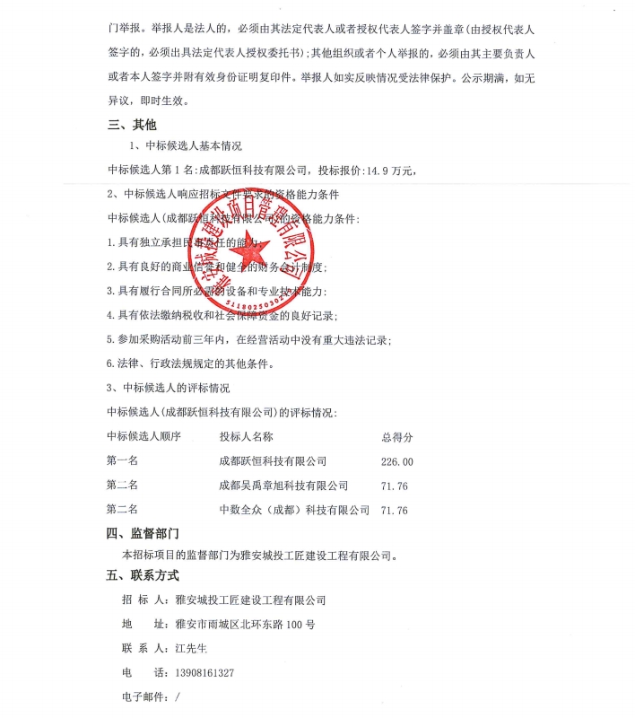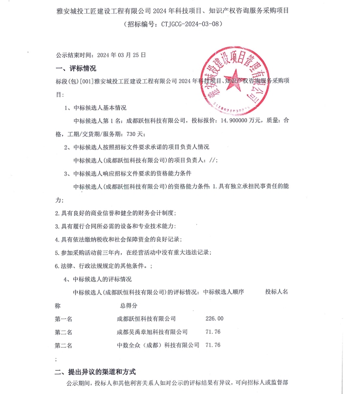雅安城投工匠建設工程有限公司2024年科技項目、知識產權咨詢服務采購項目公示