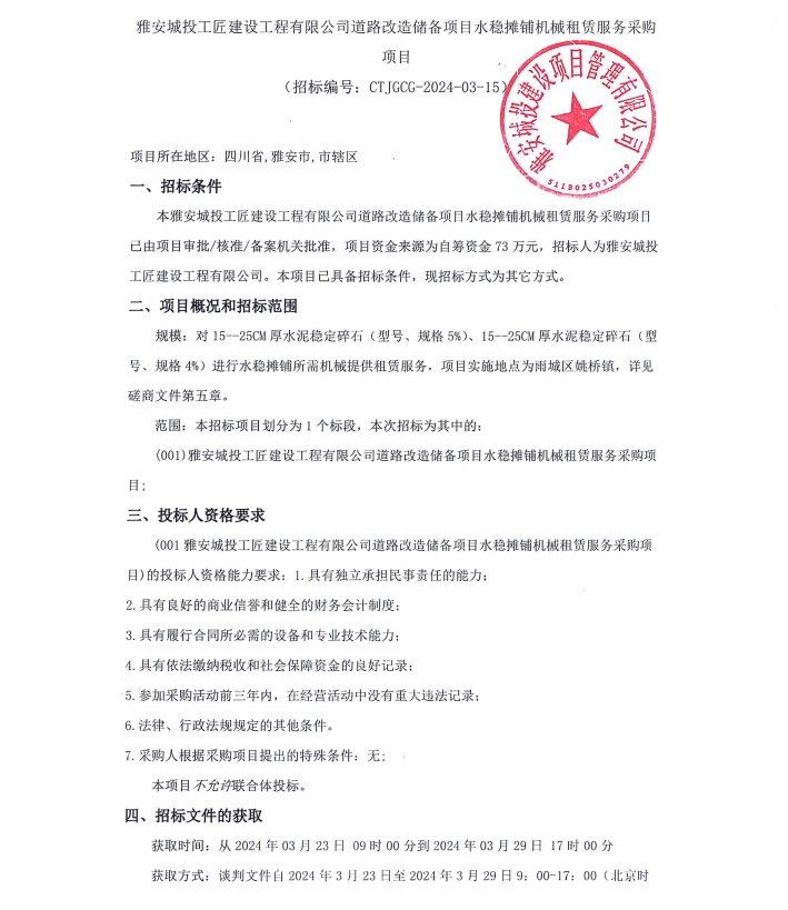 雅安城投工匠建設工程有限公司道路改造儲備項目水穩(wěn)攤鋪機械租賃服務采購項目公告