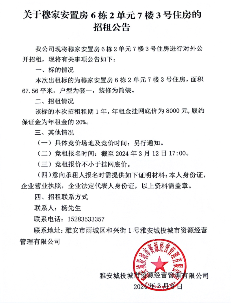 關(guān)于穆家安置房6棟2單元7樓3號(hào)住房的招租公告