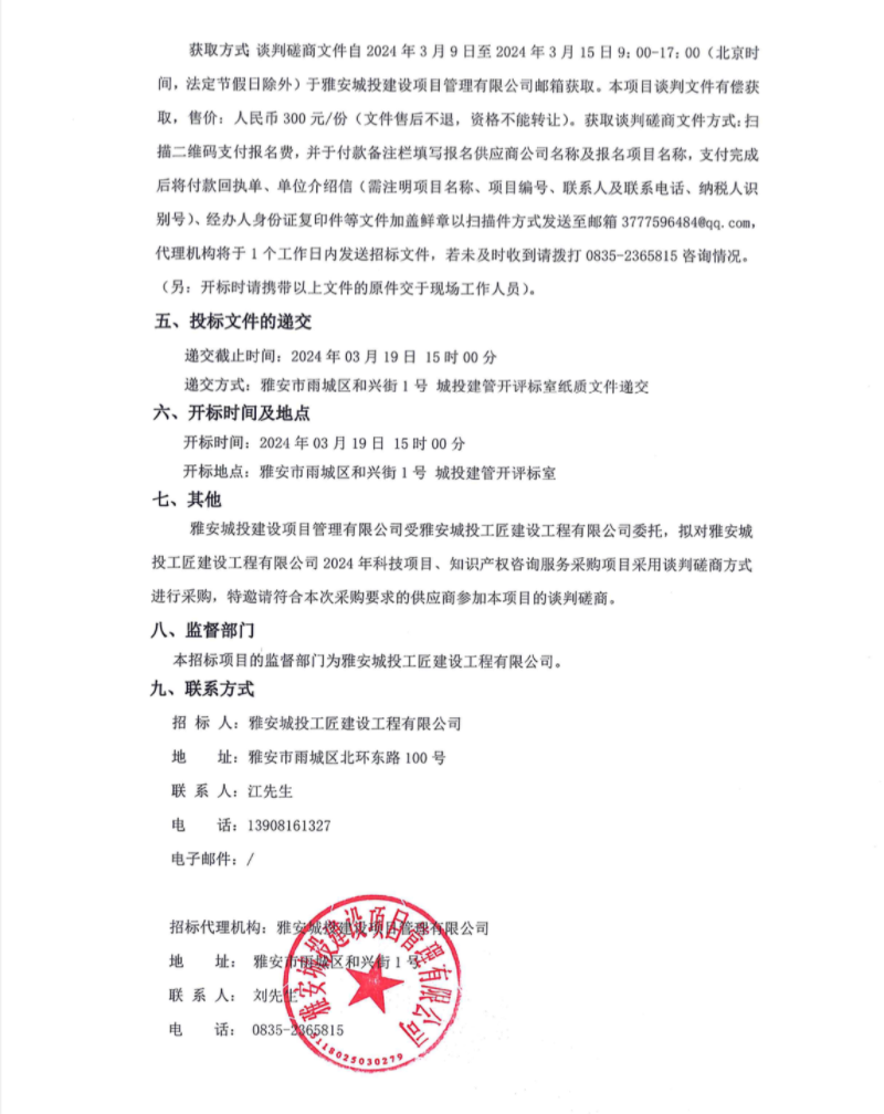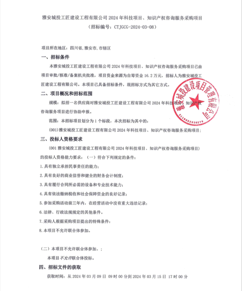 雅安城投工匠建設(shè)工程有限公司2024年科技項目、知識產(chǎn)權(quán)咨詢服務(wù)采購項目