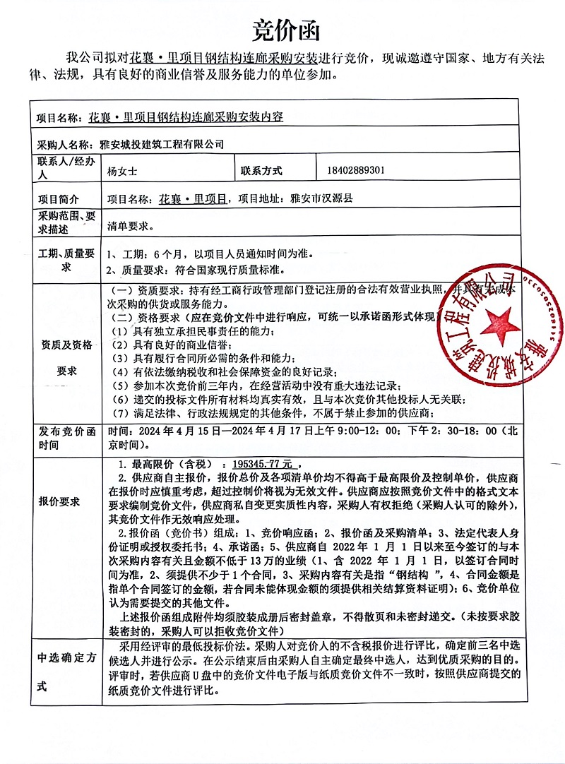 花襄·里項(xiàng)目鋼結(jié)構(gòu)連廊采購安裝競(jìng)價(jià)公告