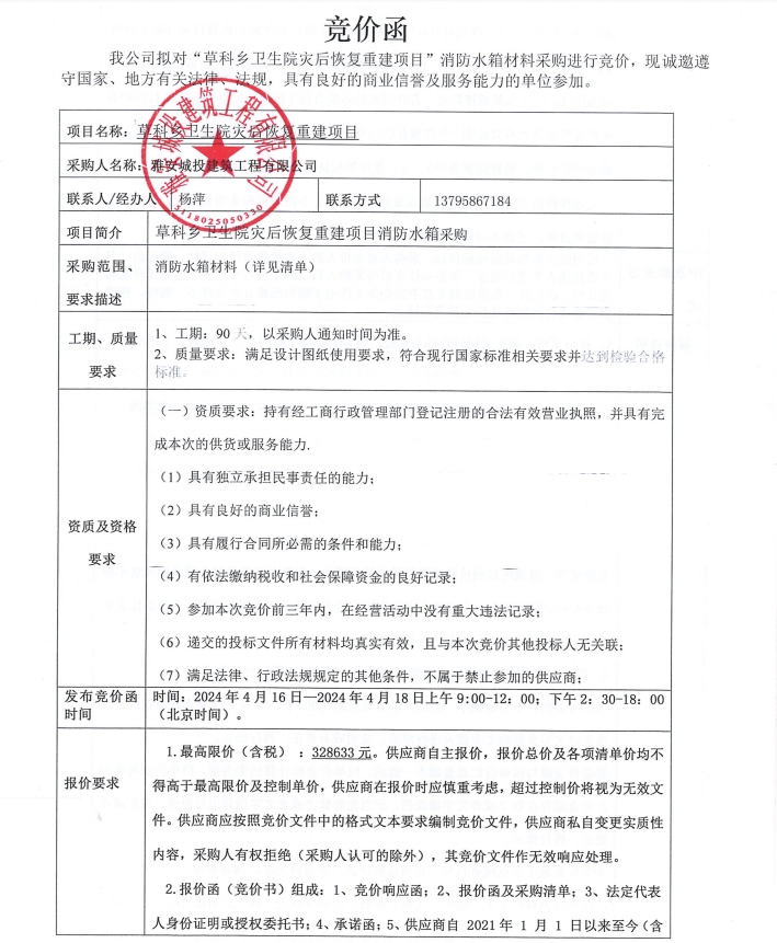 石棉縣草科鄉(xiāng)衛(wèi)生院災后恢復重建項目消防水箱材料采購競價公告