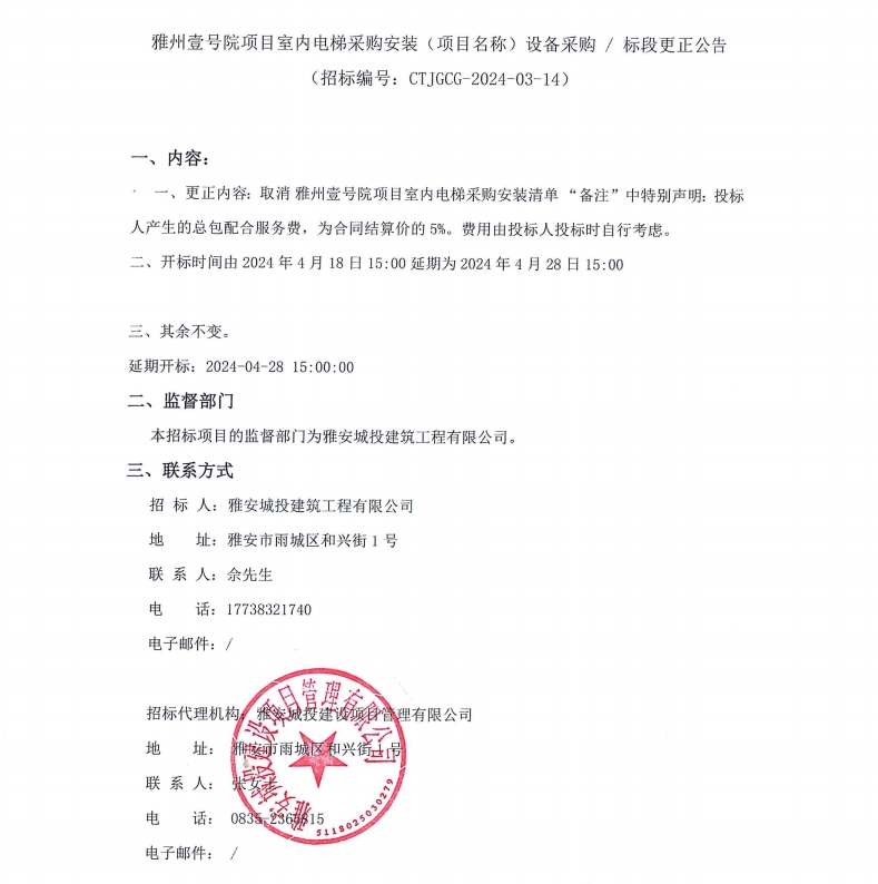 雅州壹號院項目室內電梯采購安裝(項目名稱)設備采購/標段更正公告