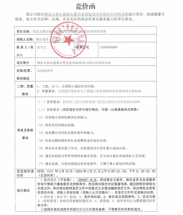 穆家及雅東麗都安置房裝飾裝修項目廚潔具材料采購(第三次)競價公告