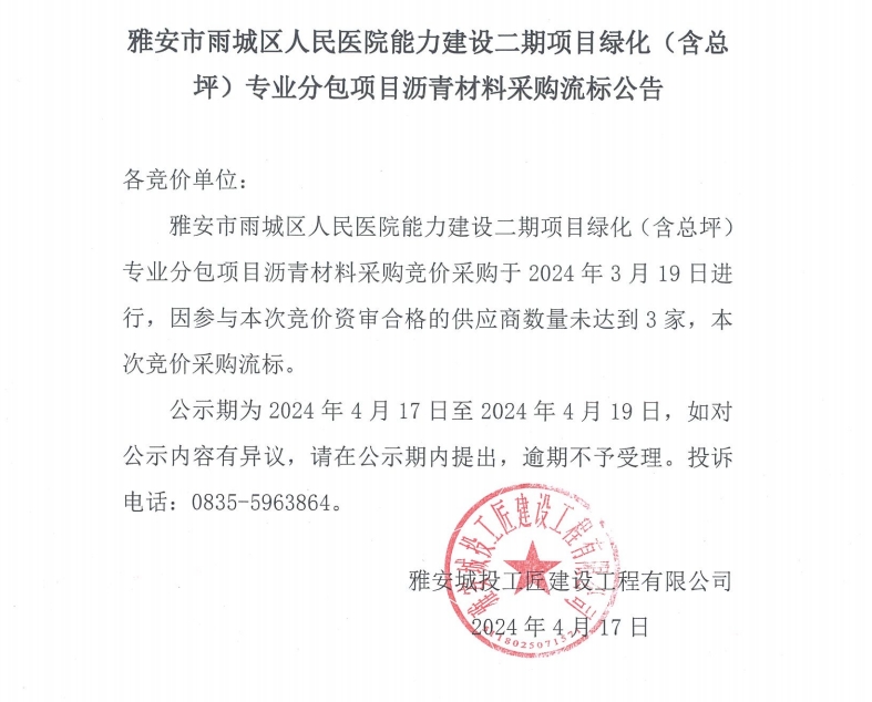 雅安市雨城區(qū)人民醫(yī)院能力建設(shè)二期項目綠化(含總坪)專業(yè)分包項目瀝青材料采購流標(biāo)公告