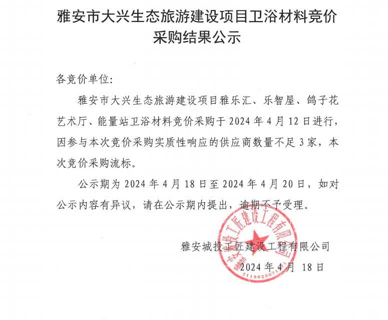 雅安市大興生態(tài)旅游建設(shè)項目衛(wèi)浴材料競價采購結(jié)果公示