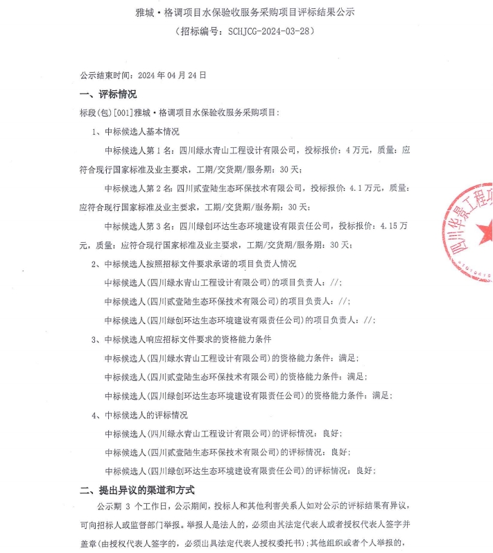 雅城·格調(diào)項(xiàng)目水保驗(yàn)收服務(wù)采購項(xiàng)目評標(biāo)結(jié)果公示