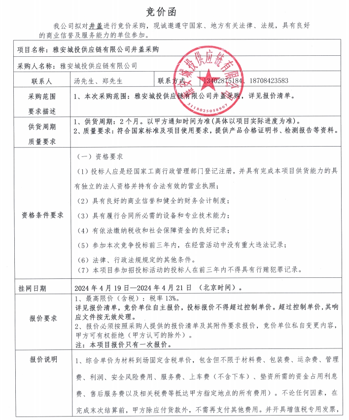 雅安城投供應(yīng)鏈有限公司井蓋采購競(jìng)價(jià)公告