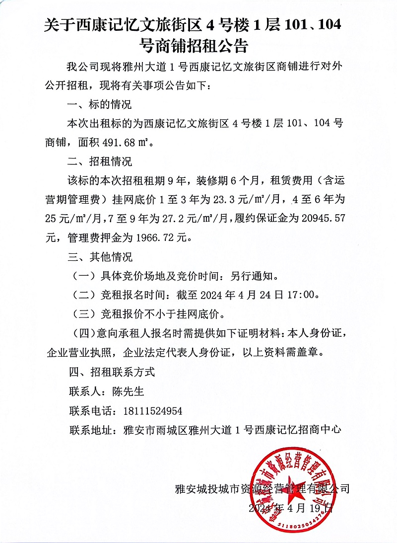 關(guān)于西康記憶文旅街區(qū)4號(hào)樓1層101、104號(hào)商鋪招租公告