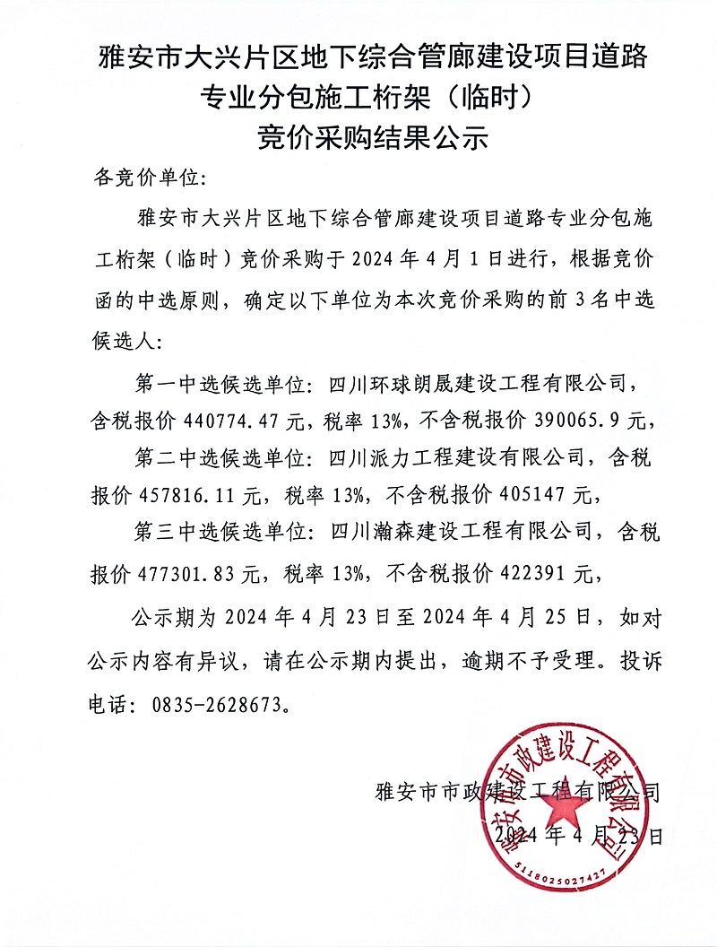 雅安市大興片區(qū)地下綜合管廊建設(shè)項(xiàng)目道路專(zhuān)業(yè)分包施工桁架(臨時(shí))競(jìng)價(jià)采購(gòu)結(jié)果公示