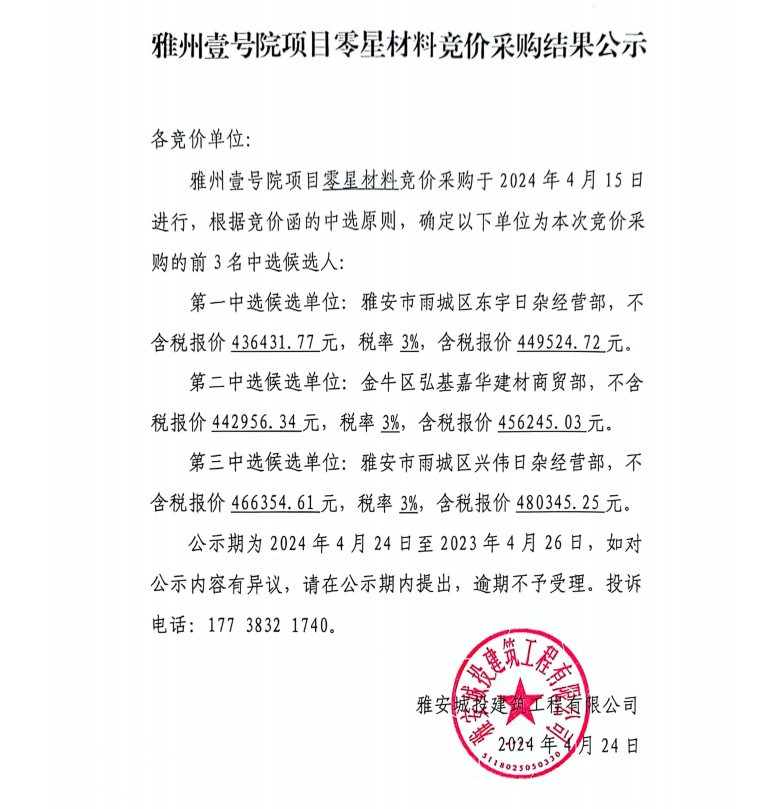 雅州壹號(hào)院項(xiàng)目零星材料競(jìng)價(jià)采購(gòu)結(jié)果公示