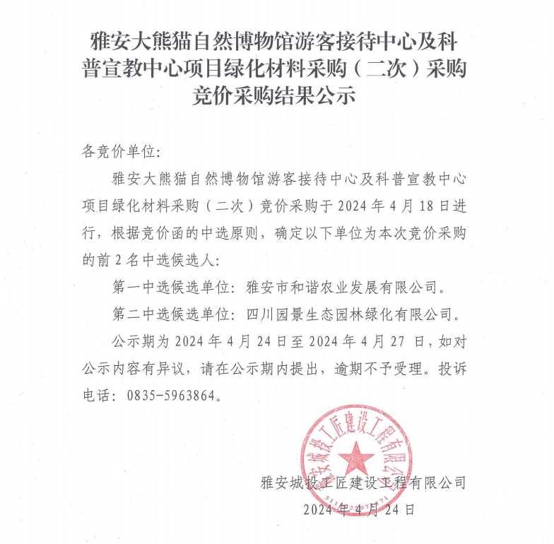 雅安大熊貓自然博物館游客接待中心及科普宣教中心項目綠化材料采購(二次)競價采購結果公示