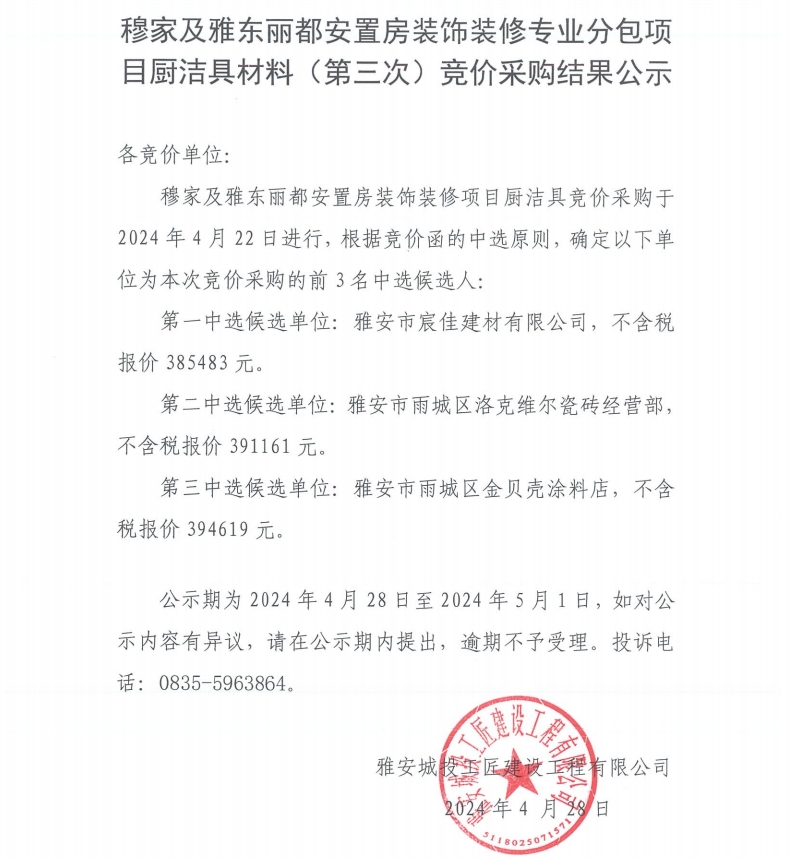 穆家及雅東麗都安置房裝飾裝修專業(yè)分包項目潔具材料(第三次)競價采購結果公示