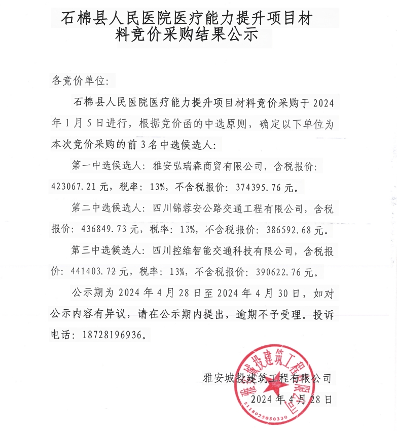 石棉縣人民醫(yī)院醫(yī)療能力提升項目材料競價采購結果公示