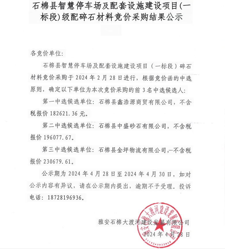 石棉縣智慧停車場及配套設(shè)施建設(shè)項目(一標段)級配碎石材料競價采購結(jié)果公示