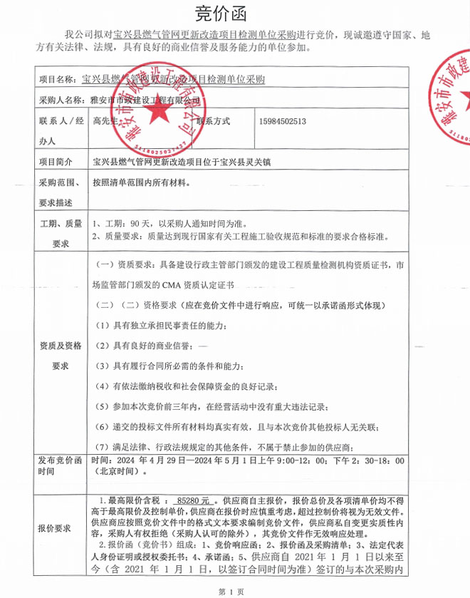 寶興縣燃?xì)夤芫W(wǎng)更新改造項(xiàng)目檢測單位采購競價(jià)公告