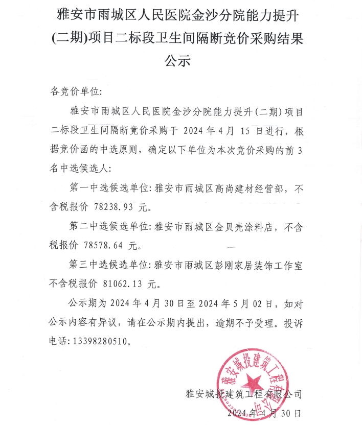 雅安市雨城區(qū)人民醫(yī)院金沙分院能力提升(二期)項目二標段衛(wèi)生間隔斷競價采購結果公示