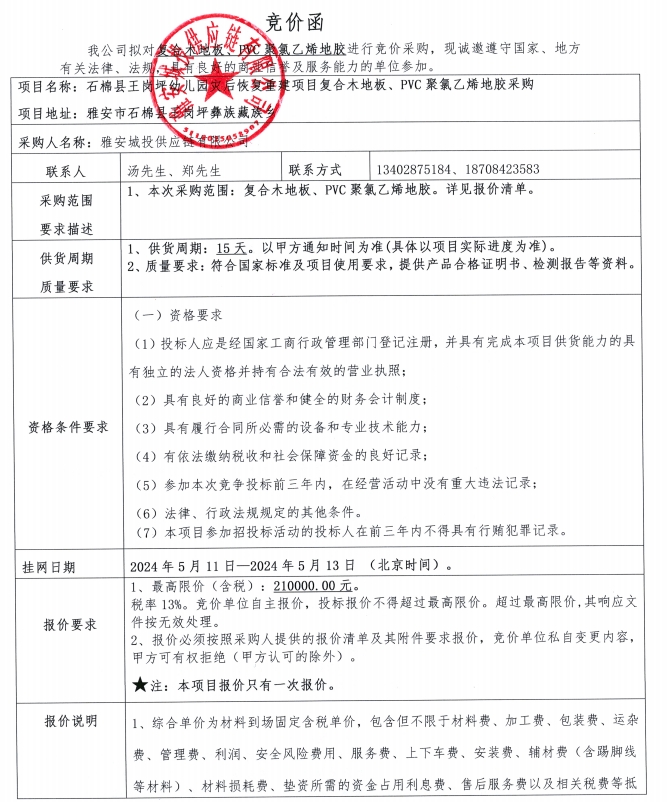 附件1:競價函--石棉縣王崗坪幼兒園災后恢復重建項目復合木地板、PVC聚氯乙烯地膠采購