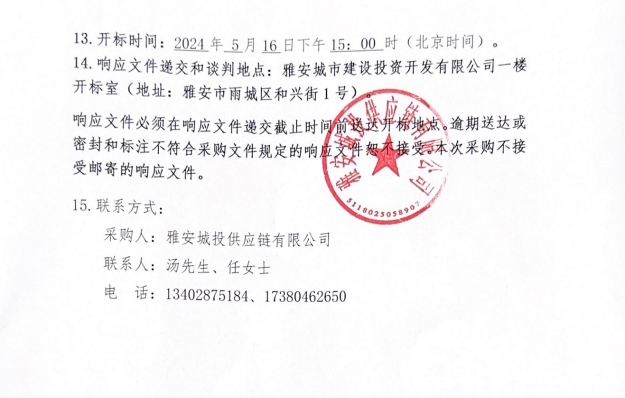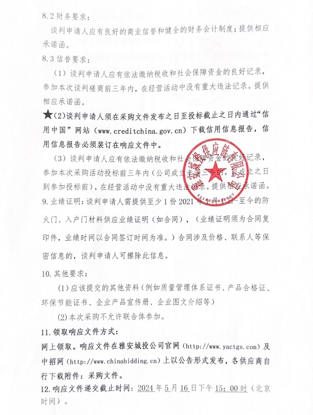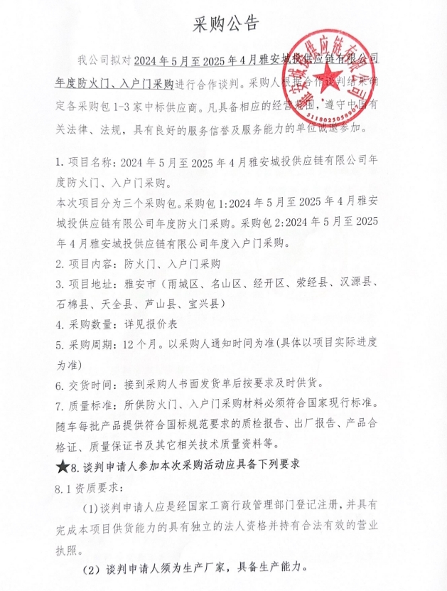2024年5月至2025年4月雅安城投供應(yīng)鏈有限公司年度防火門、入戶門采購公告