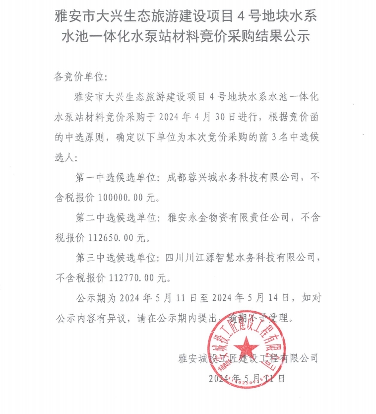 雅安市大興生態(tài)旅游建設(shè)項(xiàng)目4號(hào)地塊水系水池一體化水泵站材料競(jìng)價(jià)采購結(jié)果公示