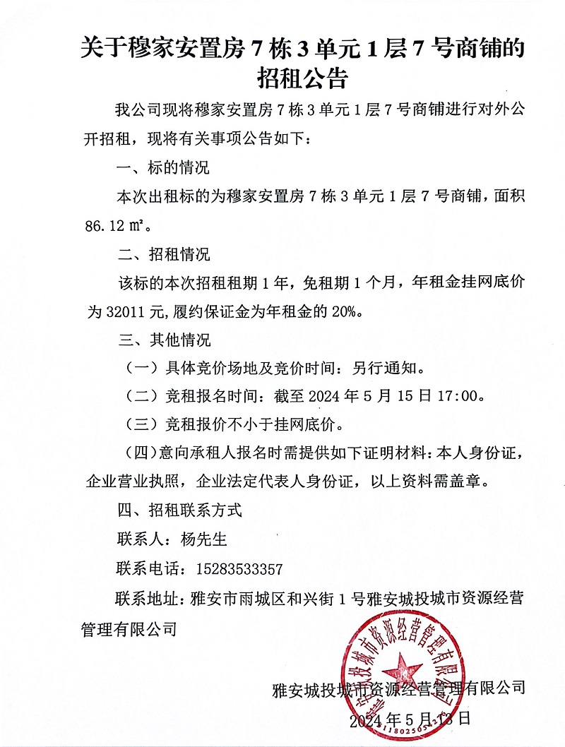 關于穆家安置房7棟3單元1層7號商鋪的招租公告