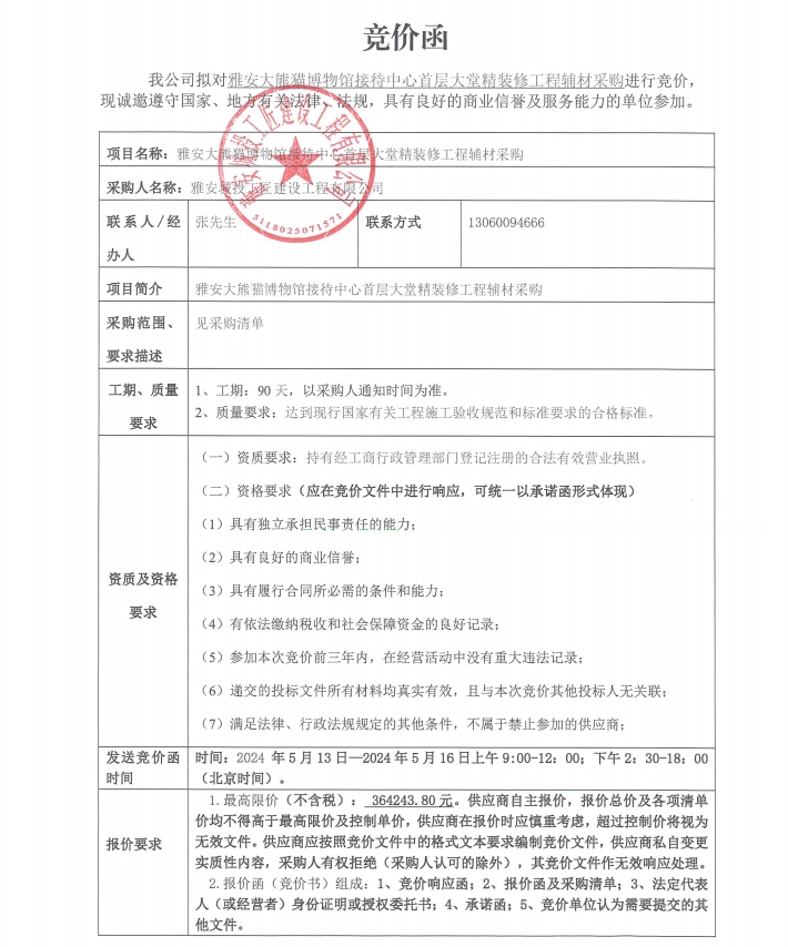 雅安大熊貓博物館接待中心首層大堂精裝修工程輔材采購(gòu)競(jìng)價(jià)公告