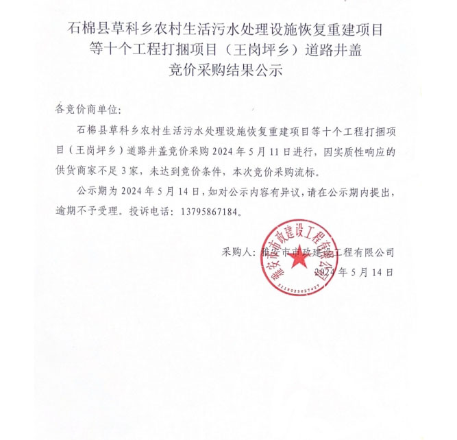 石棉縣草科鄉(xiāng)農(nóng)村生活污水處理設(shè)施恢復(fù)重建項(xiàng)目等十個(gè)工程打捆項(xiàng)目(王崗坪鄉(xiāng))道路井蓋競(jìng)價(jià)采購(gòu)結(jié)果公示