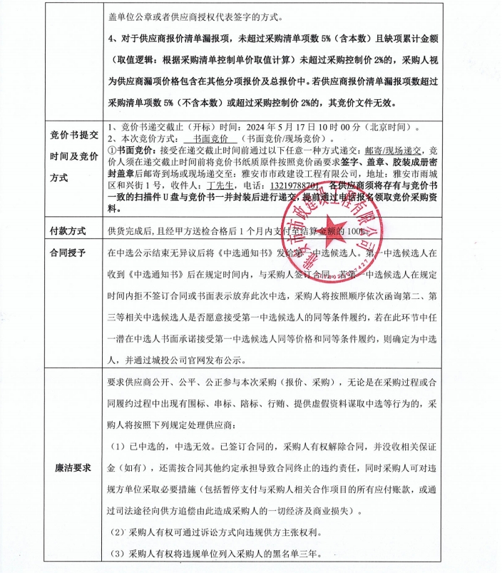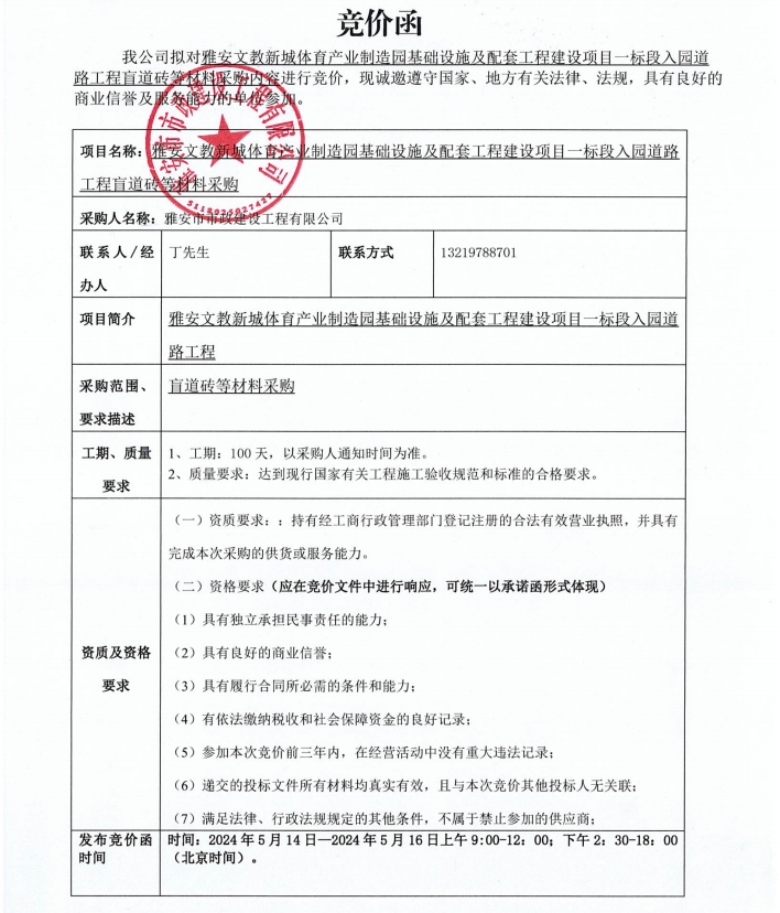 雅安文教新城體育產(chǎn)業(yè)制造園基礎(chǔ)設(shè)施及配套工程建設(shè)項目一標(biāo)段入園道路工程盲道磚等材料采購競價公告