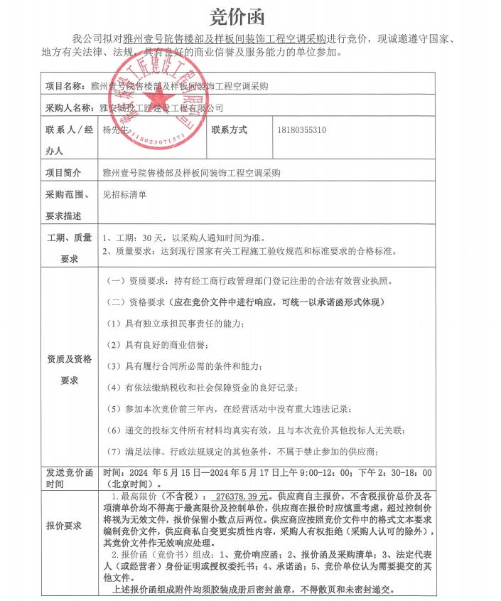 雅州壹號院售樓部及樣板間裝飾工程空調(diào)采購競價(jià)公告