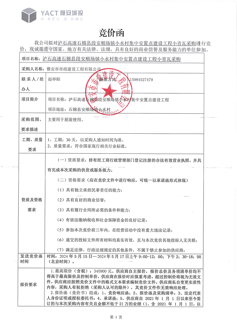 瀘石高速石棉縣段安順場鎮(zhèn)小水村集中安置點(diǎn)建設(shè)工程項目施工瓦片采購競價公告