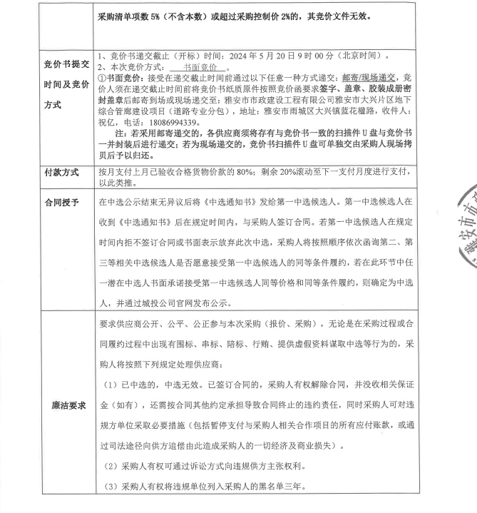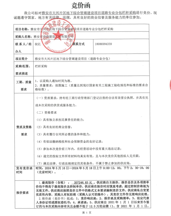 雅安市大興片區(qū)地下綜合管廊建設項目道路專業(yè)分包欄桿采購競價公告