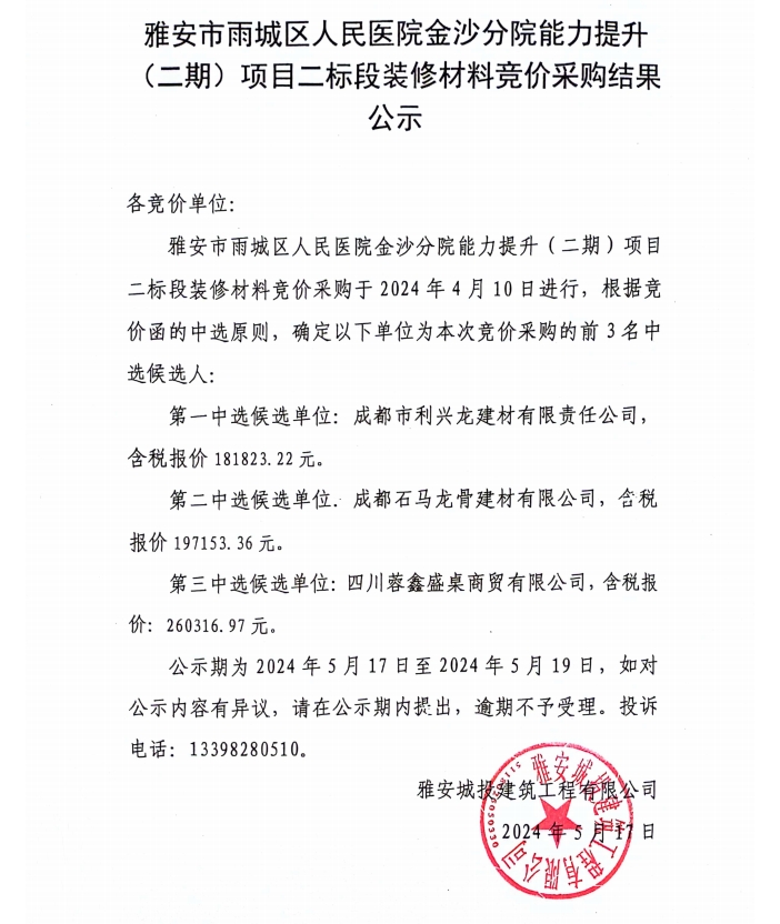 雅安市雨城區(qū)人民醫(yī)院金沙分院能力提升(二期)項(xiàng)目二標(biāo)段裝修材料競(jìng)價(jià)采購(gòu)結(jié)果公示