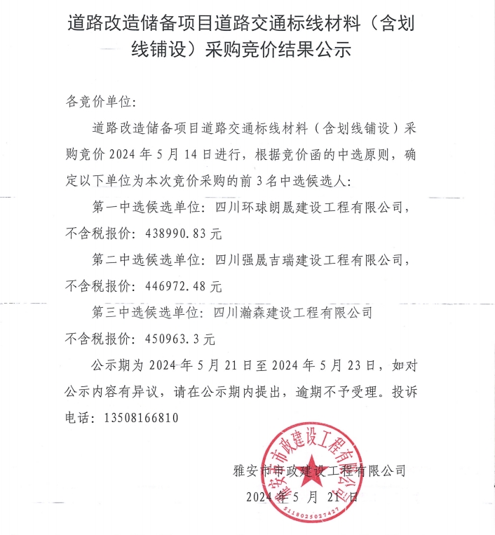 道路改造儲(chǔ)備項(xiàng)目道路交通標(biāo)線材料(含劃線鋪設(shè))采購競價(jià)結(jié)果公示