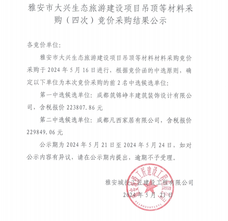雅安市大興生態(tài)旅游建設(shè)項目吊頂?shù)炔牧喜少彛ㄋ拇危└們r采購結(jié)果公示