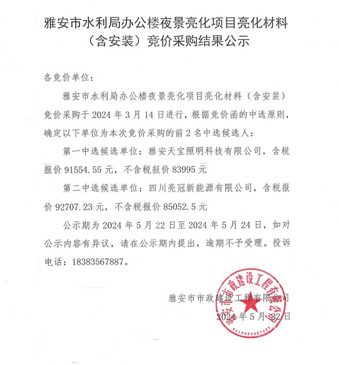 雅安市水利局辦公樓夜景亮化項目亮化材料(含安裝)競價采購結(jié)果公示