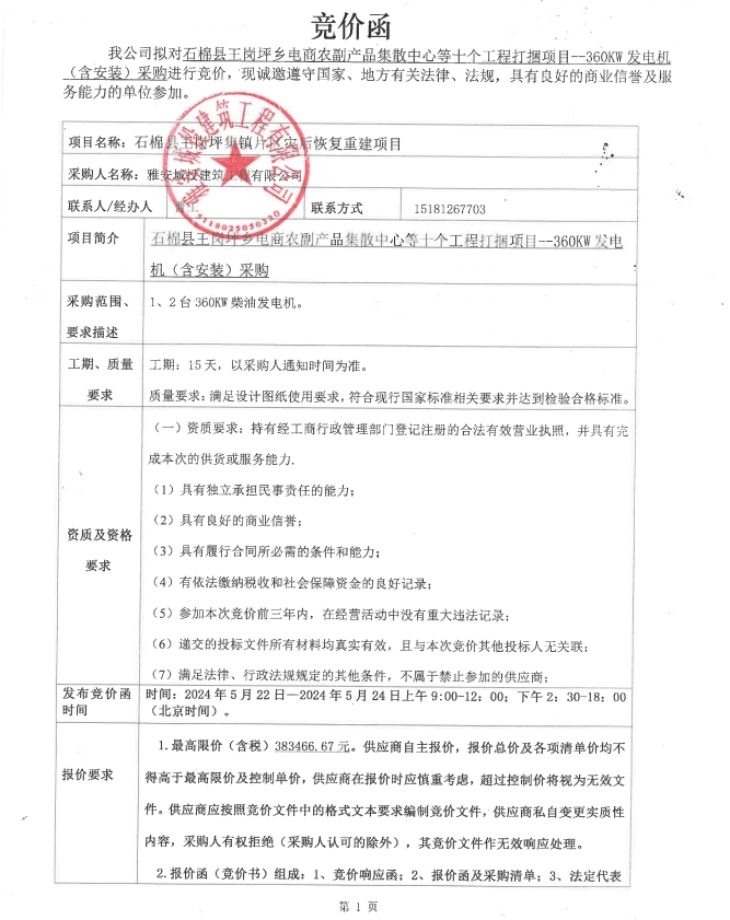 石棉縣王崗坪鄉(xiāng)電商農(nóng)副產(chǎn)品集散中心等十個(gè)工程打捆項(xiàng)目--360KW發(fā)電機(jī)(含安裝)采購競價(jià)公告