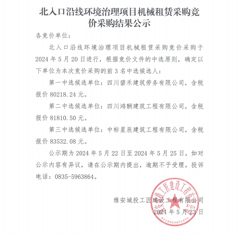 北入口沿線環(huán)境治理項(xiàng)目機(jī)械租賃采購(gòu)競(jìng)價(jià)采購(gòu)結(jié)果公示