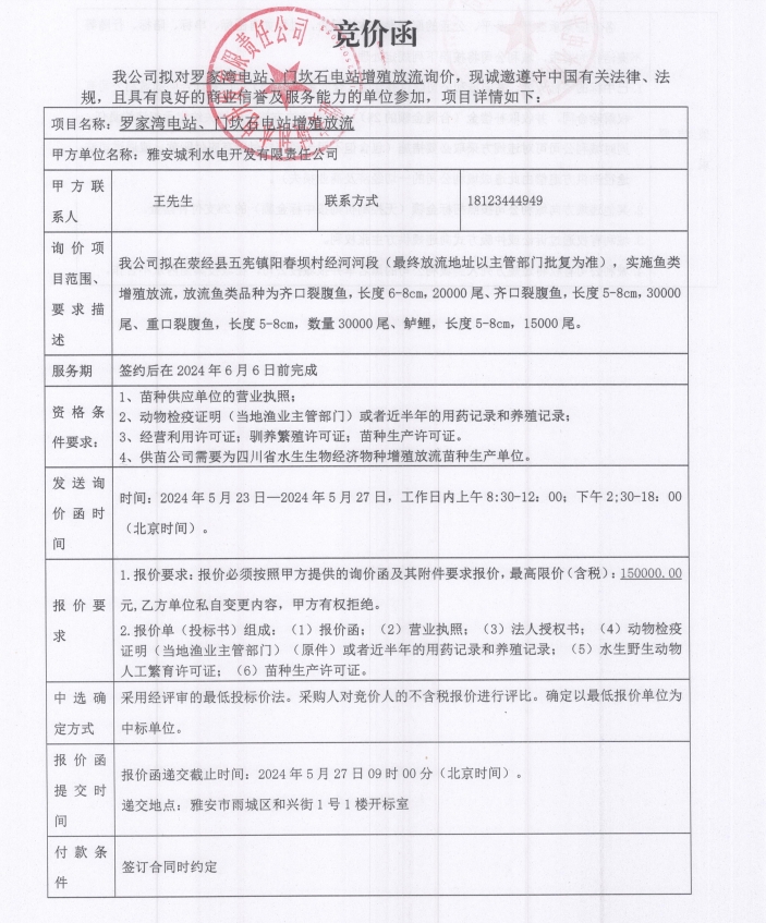 羅家灣電站、門坎石電站增殖放流競價公告