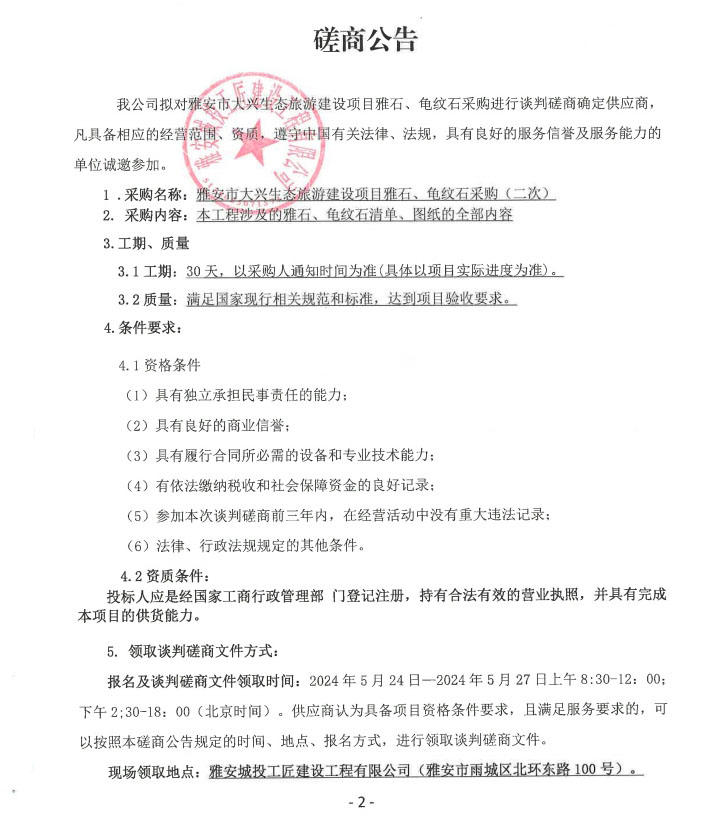 雅安市大興生態(tài)旅游建設項目雅石、龜紋石(二次)采購(第二次)磋商公告