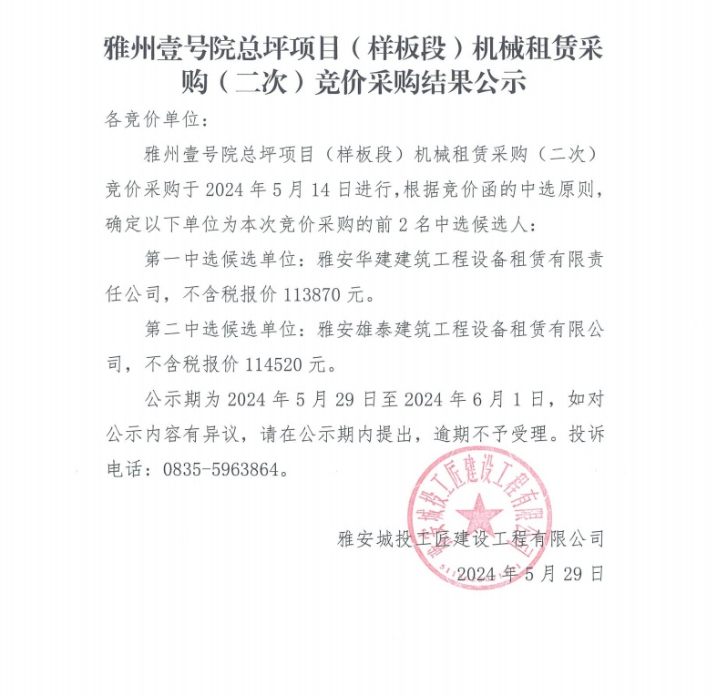 雅州壹號院總坪項(xiàng)目(樣板段)機(jī)械租賃采購(二次)競價采購結(jié)果公示
