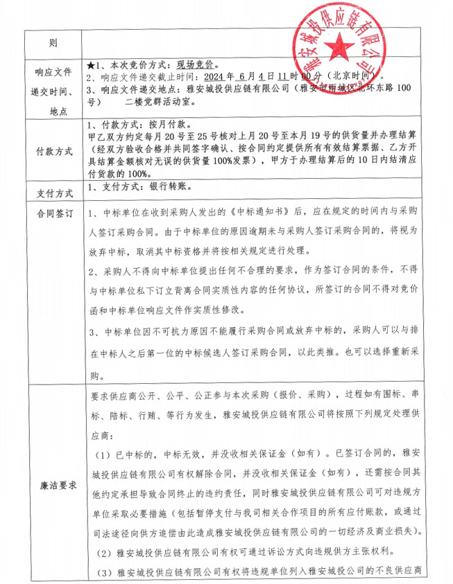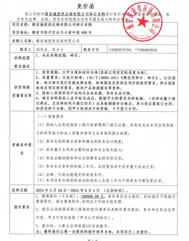 雅安城投供應鏈有限公司碎石采購競價公告