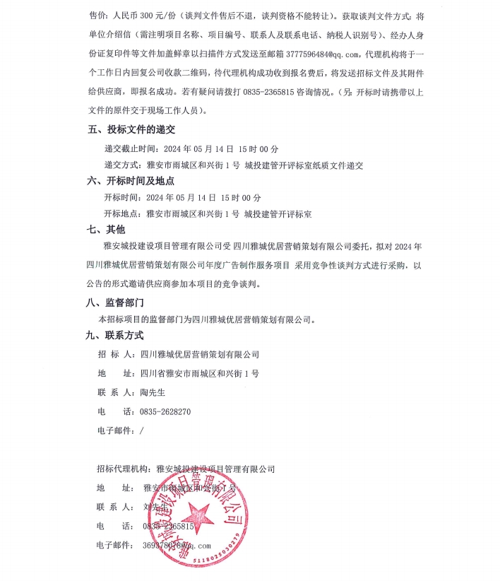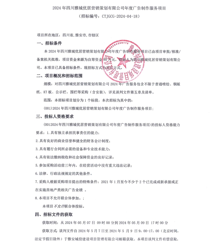 2024年四川雅城優(yōu)居營銷策劃有限公司年度廣告制作服務(wù)項目公告