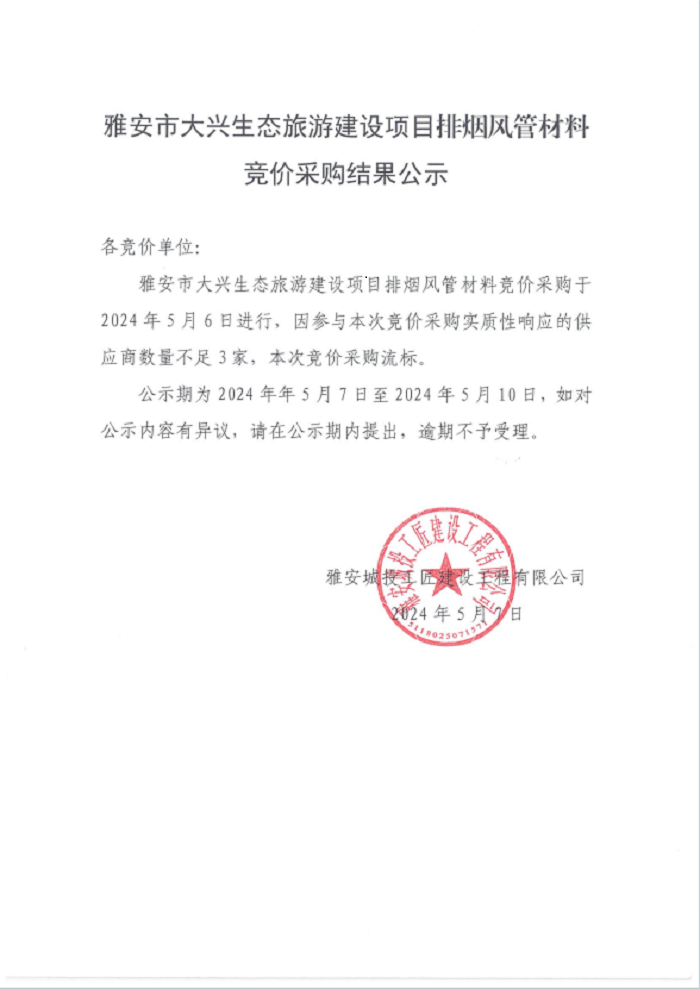 雅安市大興生態(tài)旅游建設(shè)項(xiàng)目排煙風(fēng)管材料競(jìng)價(jià)采購(gòu)結(jié)果公示