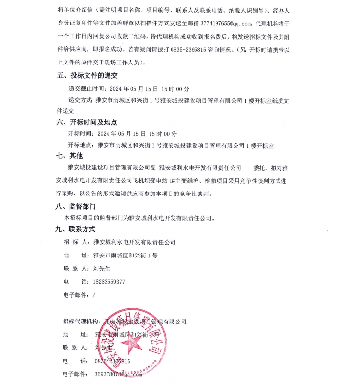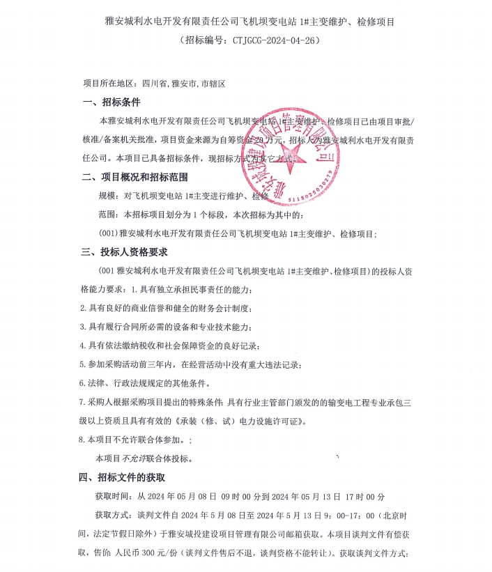 雅安城利水電開(kāi)發(fā)有限責(zé)任公司飛機(jī)壩變電站1#主變維護(hù)、檢修項(xiàng)目公告