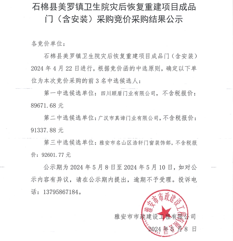 石棉縣美羅鎮(zhèn)衛(wèi)生院災(zāi)后恢復(fù)重建項(xiàng)目成品門(含安裝)采購(gòu)競(jìng)價(jià)采購(gòu)結(jié)果公示