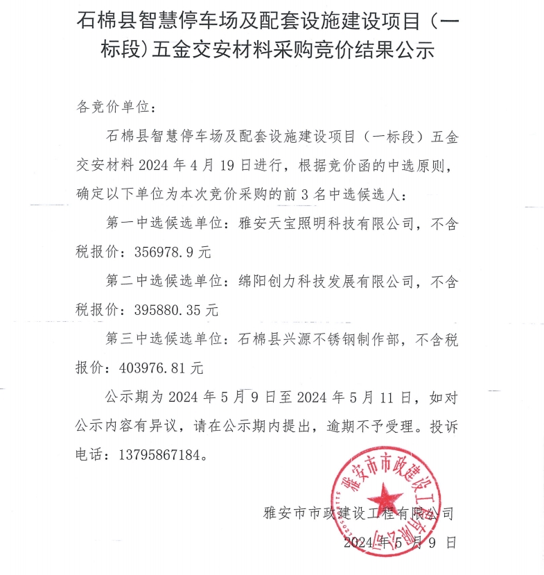 石棉縣智慧停車場(chǎng)及配套設(shè)施建設(shè)項(xiàng)目(一標(biāo)段)五金交安材料采購競價(jià)結(jié)果公示
