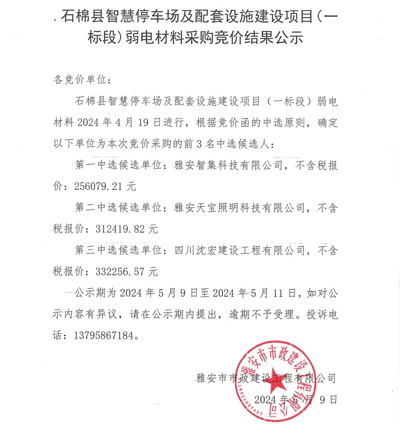 石棉縣智慧停車(chē)場(chǎng)及配套設(shè)備建設(shè)項(xiàng)目(一標(biāo)段)弱電材料采購(gòu)競(jìng)價(jià)結(jié)果公示